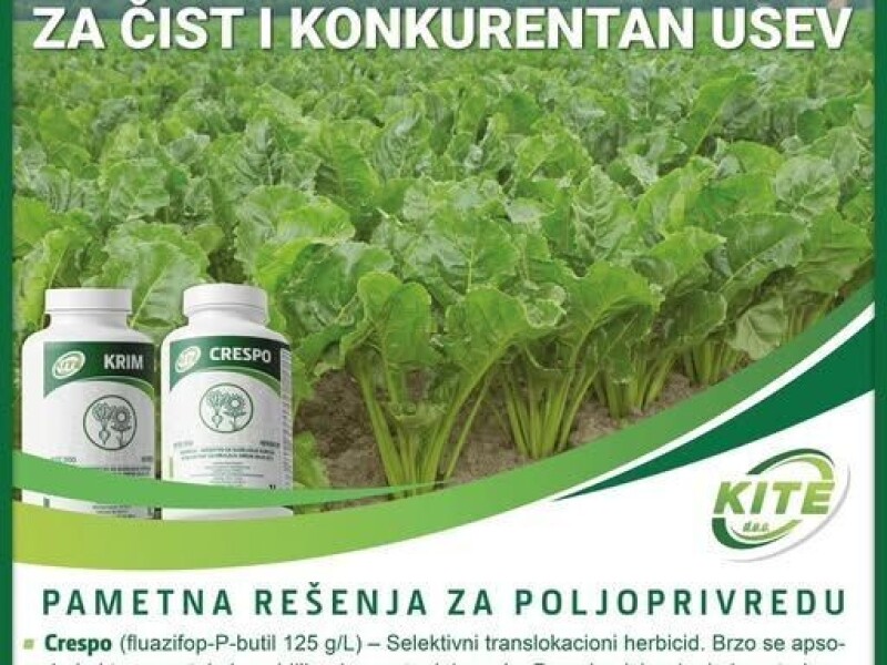 👉 Crespo (Fluazifop-P-butil 125 g/L) – brzo se apsorbuje i efikasno eliminiše širok spektar uskolisnih korova. Preporučena primena: 1,0–1,5 l/ha.