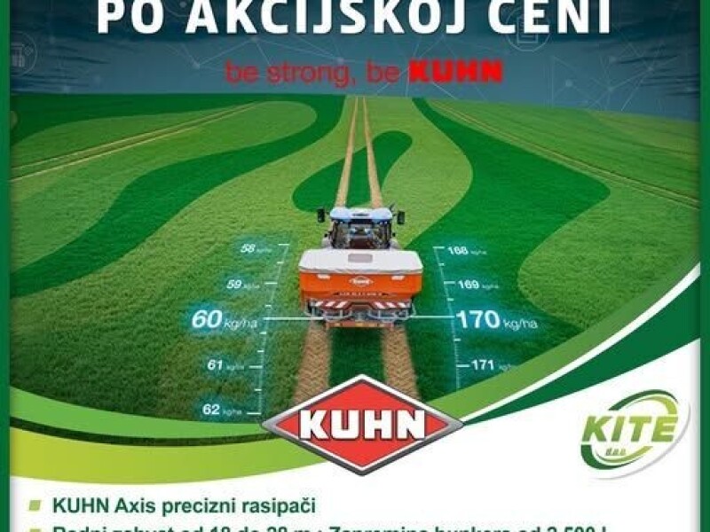 KUHN AXIS rasipači - akcijska cena do 15. februara. Obezbeđuju maksimalno precizno doziranje mineralnih đubriva po celoj površini parcele. Opremljeni ISOBUS prikjučkom, savršeno se agregatiraju sa istim takvim traktorima ostavljajući mogućnost rasturanja đubriva po celoj površini zemlje, ali i precizno doziranje one količine đubriva koja je na određenoj zoni parcele potrebna - varijabilno đubrenje.