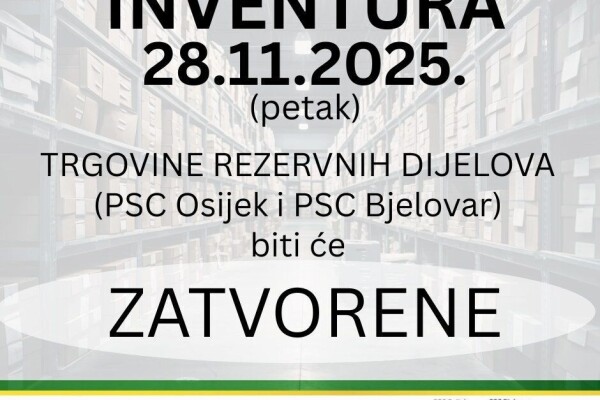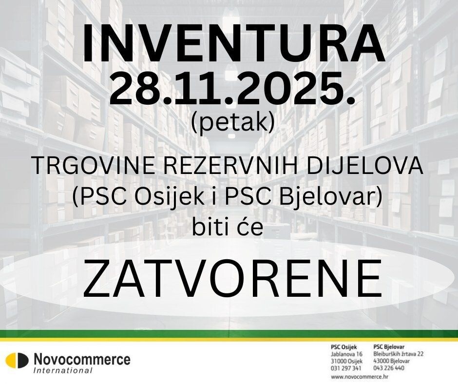 OBAVIJEST‼️ Petak, 28.11.2025., naša trgovina rezervnih dijelova u Osijeku i Bjelovaru biti će zatvorena zbog inventure.