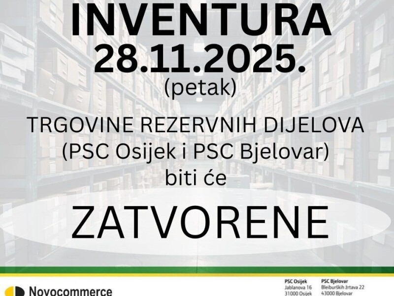 OBAVIJEST‼️ Petak, 28.11.2025., naša trgovina rezervnih dijelova u Osijeku i Bjelovaru biti će zatvorena zbog inventure.