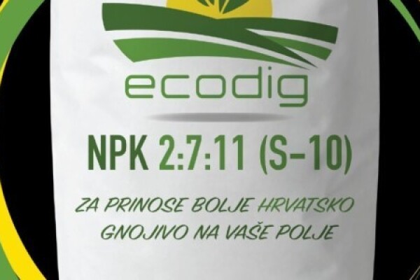 Ecodig NPK 2-7-11 (S-10), organsko-mineralno peletirano gnojivo Opis proizvoda ECODIG-C je organsko-mineralno peletirano gnojivo nastalo anaerobnom fermentacijom biljnih minerala i gnoja iz stočarske...