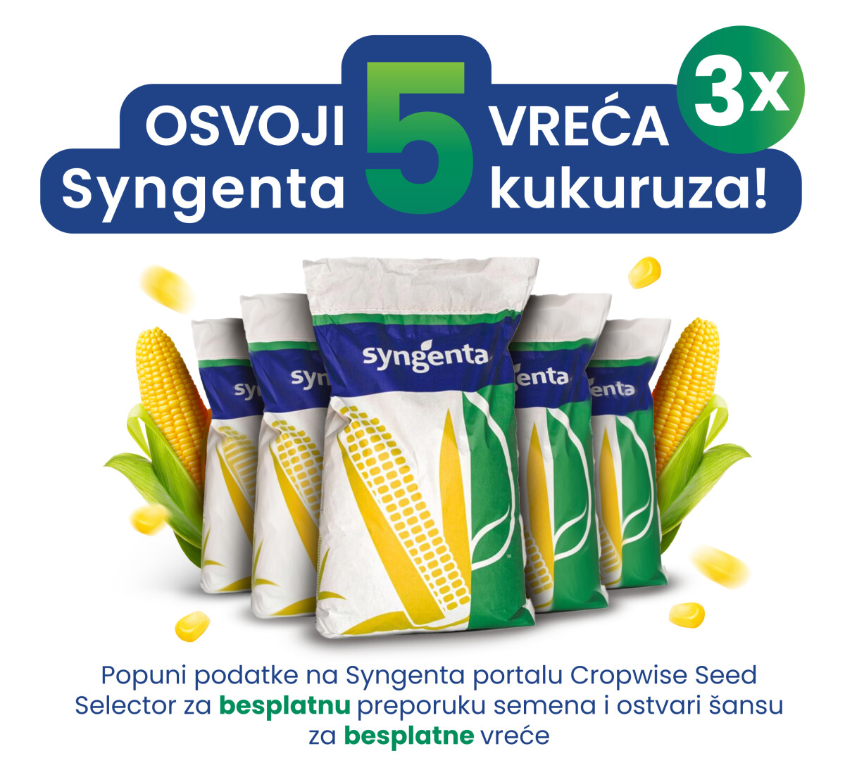 Svi poljoprivrednici koji putem Cropwise® Seed Selector platforme potpuno besplatno preuzmu personalizovanu preporuku za setvu suncokreta ili kukuruza, i otvore je putem email-a ili SMS-a, imaju šansu da osvoje 5 vreća Syngenta kukuruza!