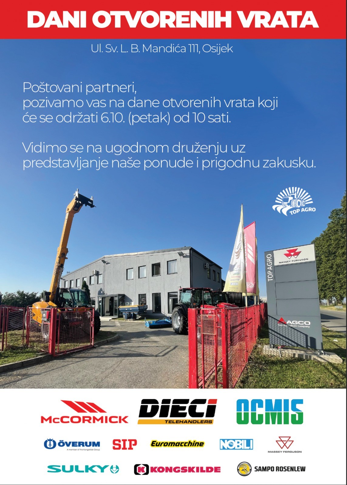 Top Agro poziva sve svoje kupce i poslovne partnere na druženje te predstavljanje noviteta i strojeva iz široke palete brendova koje zastupaju. Izloženo će biti i veliki broj odmah dostupnih stojeva. Ovom prilikom svi zainteresirani moći će strojeve detaljno pogledati i isprobati te potražiti savjet stučne osobe.