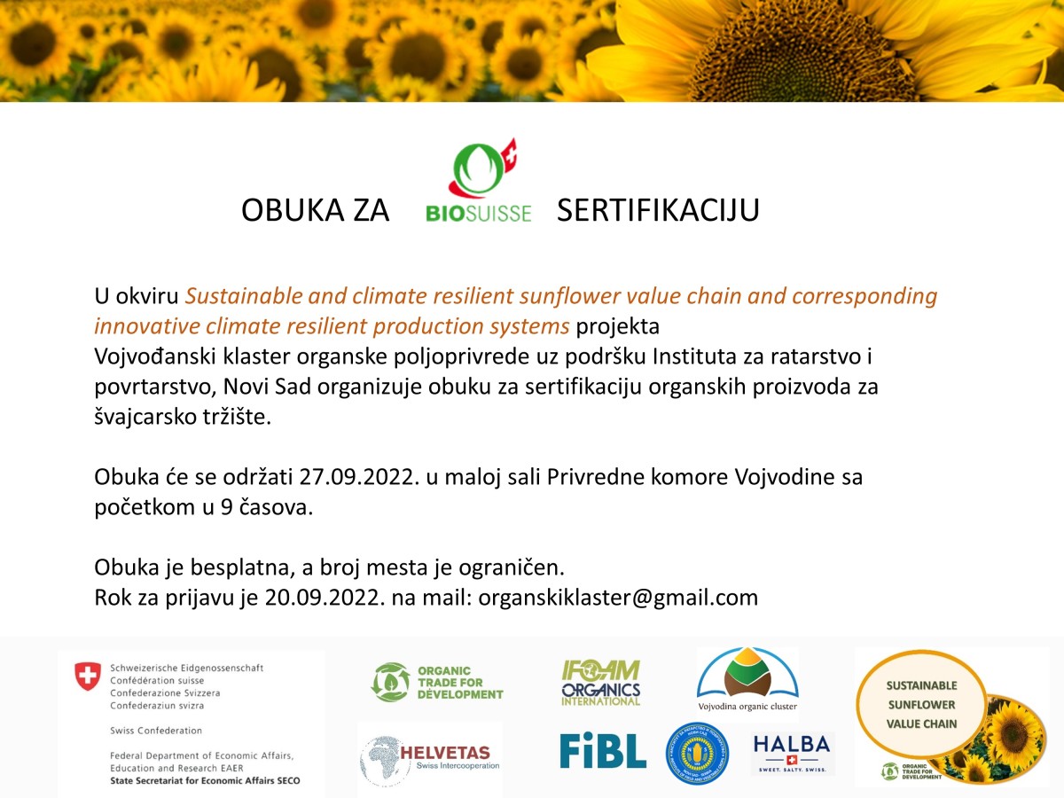 Ne propustite priliku da čujete više o mogućnosti sertifikacije vaših organskih proizvoda za Švajcarsko tržište po BioSuisse standardu. Za to ćete imati priliku na treningu koji organizujemo u okviru Sustainable sunflower value chain OT4D/PPP projekta.