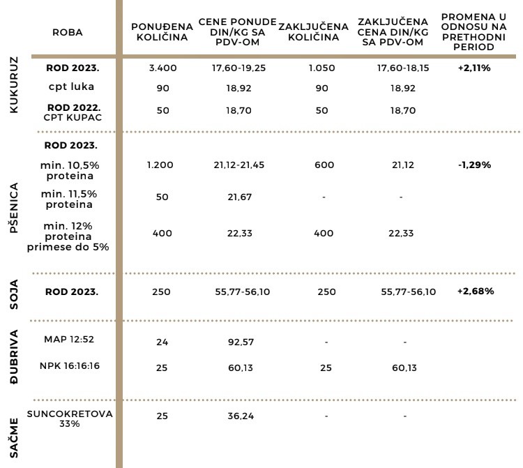 Pregled ponuđenih i zaključenih količina, kao i raspon ponuđenih i zaključenih cena poljoprivrednih proizvoda u posmatranom periodu, dati su u sledećoj tabeli: