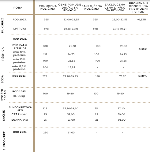 Pregled ponuđenih i zaključenih količina, kao i raspon ponuđenih i zaključenih cena poljoprivrednih proizvoda u posmatranom periodu, dati su u sledećoj tabeli: