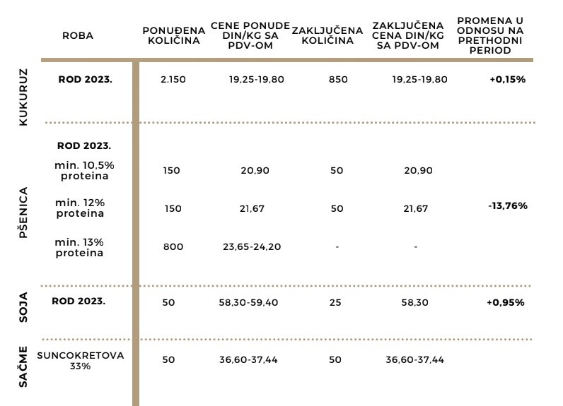 Preko Produktne berze tokom ove nedelje prometovano je 1.025,00 tona robe (24,63 odsto manje nego prethodne nedelje), ukupne finansijske vrednosti 22.195.500,00 dinara. U poslednjoj sedmici 2023. godine primetna je bila slaba aktivnost na tržištu, a kao i prethodne dve nedelje, ponovo je primarna kultura u trgovanju bio kukuruz.