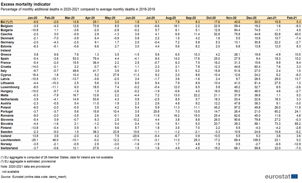 Kada je reč o podacima o smrtnosti za vreme pandemije zavisno od delatnosti, u Evropskoj uniji oni ne postoje. Ali, da se ona uopšteno povećala u prošloj godini, pokazuju rezultati koje je ovog meseca objavio Eurostat.