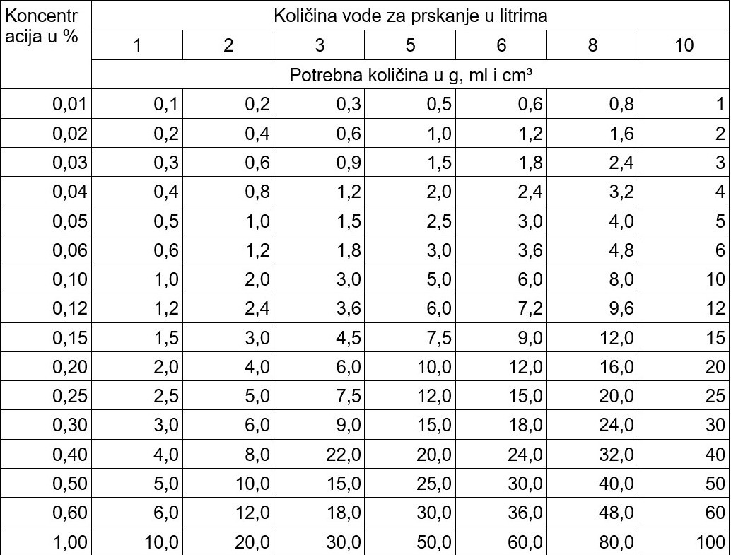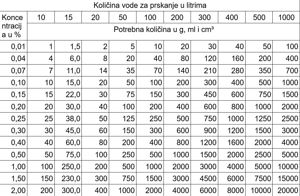 Ako imate onu kapaciteta pet litara, a potrebno je imati koncentraciju 0,02 odsto, tada iz tabele možemo očitati da je potrebno u vodu dodati jedan gram ili jedan mililitar sredstva.