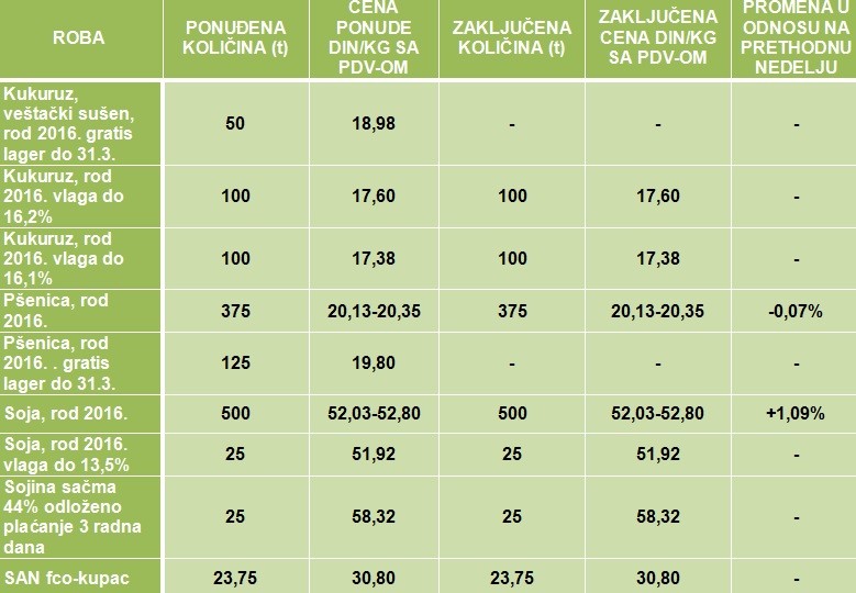 Pšenica ima veoma stabilnu cenu. Cena hlebnog zrna je u proseku iznosila 18,49 din/kg bez PDV-a. Ponderisana nedeljna cena zrna soje iznosi 47,51 dinara. Kukuruz nije kupovan, đubrivo nepromenjene cene.