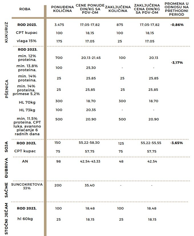 Kada su u pitanju mineralna đubriva, zaključen je jedan berzanski ugovor za AN, ruski, po ceni od 38,67 din/kg bez PDV-a. Stočni ječam prometovan je početkom nedelje po ceni od 16,80 din/kg bez PDV-a.
