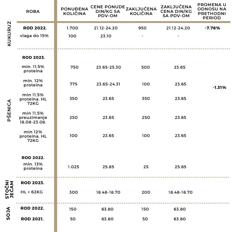 U odnosu na prethodnu nedelju, beležimo cenovni pad od 1,31 odsto. Pšenicom sa hektolitrom 72 kg se takođe trgovalo po ceni od 21,50 din/kg bez PDV-a, dok je pšenica rod 2022. godine sa hektolitrom 78 kg i proteinom 13,5 odsto prometovana po ceni od 23,50 din/kg bez PDV-a.