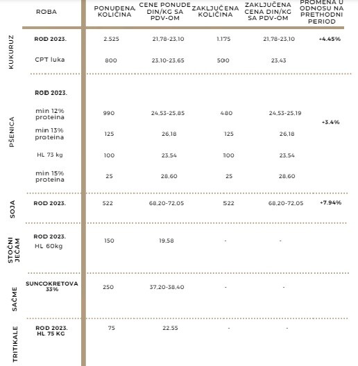 Pregled ponuđenih i zaključenih količina, kao i raspon ponuđenih i zaključenih cena poljoprivrednih proizvoda u posmatranom periodu, dati su u sledećoj tabeli:
