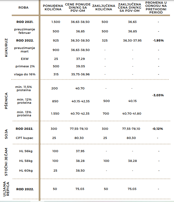 Pregled ponuđenih i zaključenih količina, kao i raspon ponuđenih i zaključenih cena poljoprivrednih proizvoda u posmatranom periodu, dati su u sledećoj tabeli:
