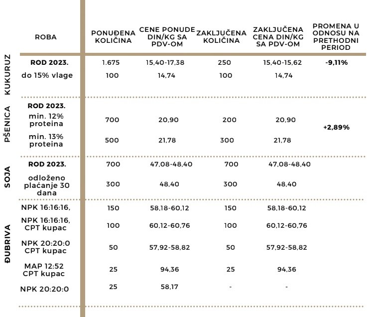 Pregled ponuđenih i zaključenih količina, kao i raspon ponuđenih i zaključenih cena poljoprivrednih proizvoda u posmatranom periodu, dati su u sledećoj tabeli: