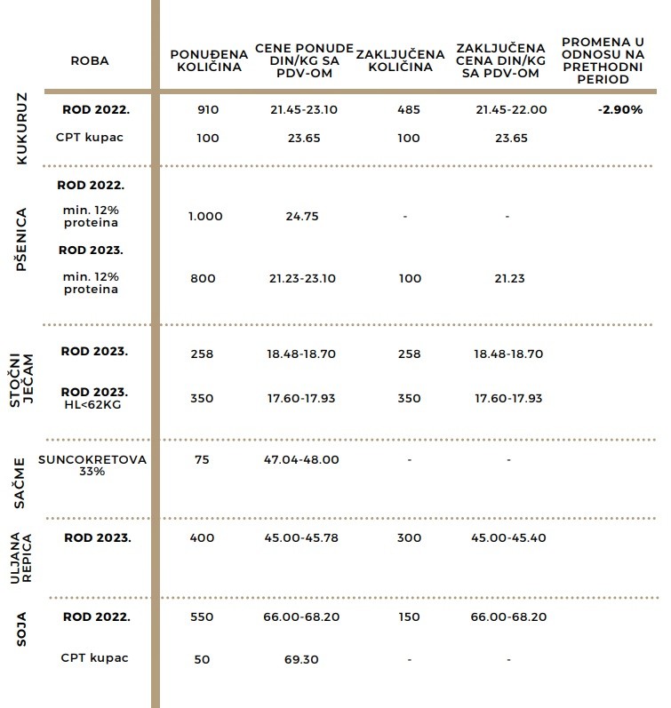 Pregled ponuđenih i zaključenih količina, kao i raspon ponuđenih i zaključenih cena poljoprivrednih proizvoda u posmatranom periodu, dati su u sledećoj tabeli: