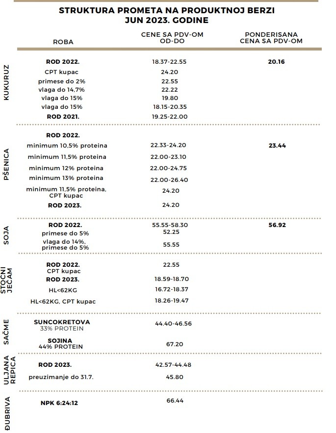 Tokom meseca juna zabeleženo je prvo trgovanje pšenicom roda 2023. godine po ceni od 22,00 din/kg bez PDV-a (24,20 din/kg sa PDV-om). Kada govorimo o pšenici rod 2022. godine, tokom prve dve nedelje u mesecu ona je bila dominantna kultura u trgovanju. Sredinom meseca došlo je do mirovanja na tržištu pšenice, budući da je ponuda bila izuzetno slaba, a razlika u paritetu potraživane i nuđene robe dodatno je otežavala zaključenje berzanskih ugovora. Pšenicu su potraživali trgovci i mlinovi, a bila je primetna i tražnja za stočnom pšenicom. Krajem meseca dolazi do povećanja aktivnosti na tržištu i zaključenja više berzanskih ugovora, te je pšenica ponovo bila najprodavaniji poljoprivredni proizvod. Pšenicom se trgovalo u cenovnom rasponu od 20,00 do 24,00 din/kg bez PDV-a, pri čemu je ponderisana cena iznosila 21,31 din/kg bez PDV-a (23,44 din/kg sa PDV-om), što je u odnosu na mesec maj pad cene od 1,11%. Trgovalo se takođe i pšenicom na paritetu CPT kupac po ceni od 22,00 din/kg bez PDV-a (24,20 din/kg sa PDV-om).