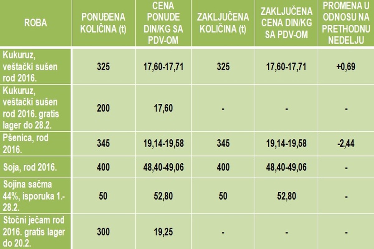Cena kukuruza iznosi 16,80 din/kg bez PDV-a, a soje 46,90 din bez PDV-a. Ovonedeljni promet predstavlja najveći količinski promet robe na nedeljnom nivou u ovoj godini.
