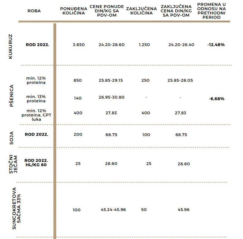 Nedelju za nama, na Produktnoj berzi, obeležile su prve tražnje za novim rodom pšenice i ječma, kao i objava Republičke direkcije za robne rezerve o kupovini do 50.000 tona merkantilne pšenice roda 2022. godine. Na tržištu se i dalje beleži pad cena svih primarnih poljoprivrednih proizvoda. Nivo prometa je niži u odnosu na prošlonedeljni i iznosio je 2.075 tona robe. Finansijska vrednost iznosila je 59.038.750,00 dinara, za 17,16 odsto manje nego sedam dana ranije.