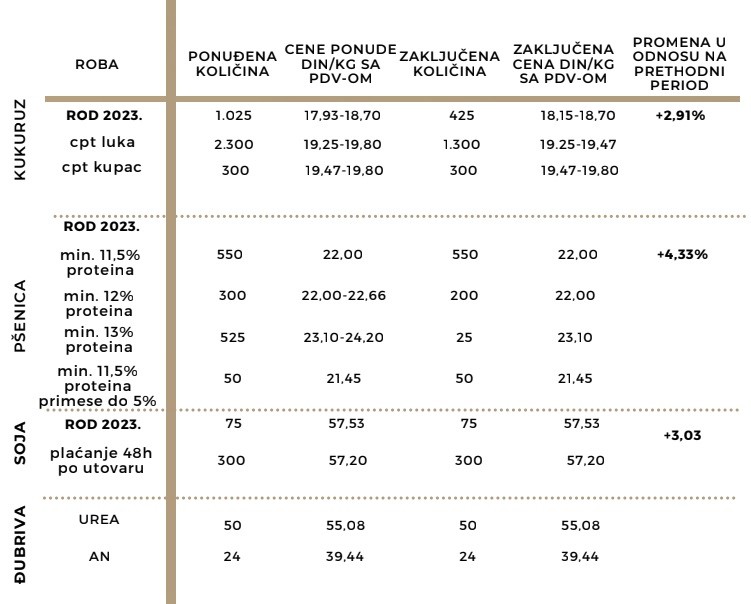Od ostalih roba, tokom ove nedelje trgovalo se mineralnim đubrivima. Berzanski ugovor za UREU u pakovanju 500/1 zaključen je po ceni od 50,07 din/kg bez PDV-a (55,08 din/kg sa PDV-om), dok je AN, ruski, u pakovanju 600/1 prometovan po ceni od 35,85 din/kg bez PDV-a (39,44 din/kg sa PDV-om).
