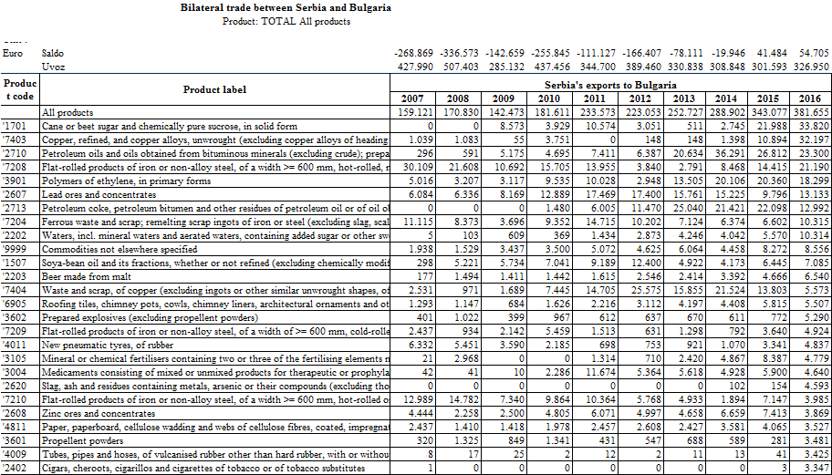 Tabela: robna razmena između Srbije i Bugarske 2007 - 2016