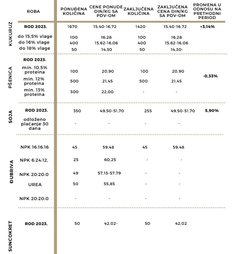 Od ostalih roba, trgovalo se mineralnim đubrivom u formulaciji NPK 16:16:16 po jedinstvenoj ceni od 54,07 din/kg bez PDV-a (59,48 din/kg sa PDV-om).