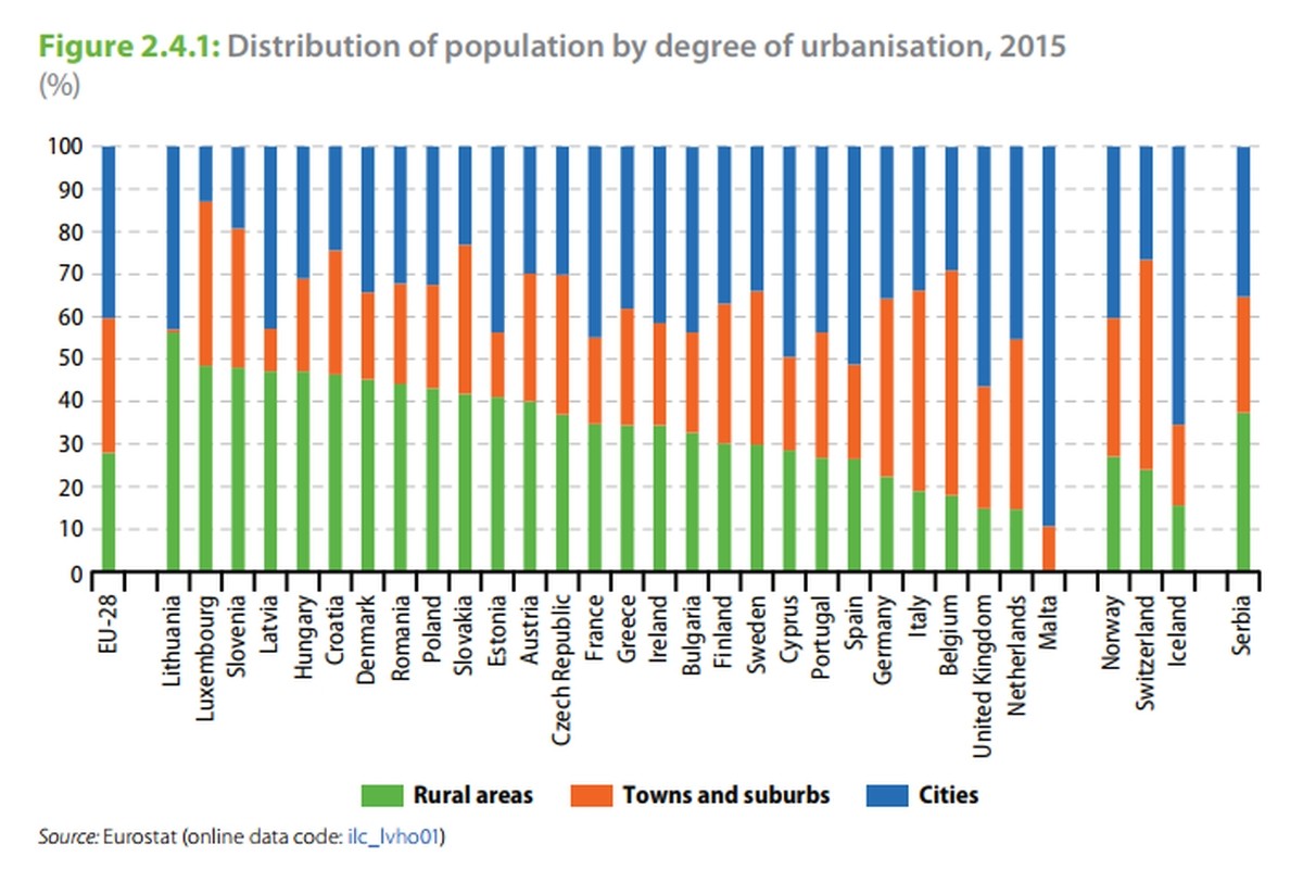 Tako se navodi da je u 2015. godini 28% ljudi u EU živelo u ruralnim područjima, 31,7% u manjim gradovima i predgrađu i 40,4% u velikim gradovima. Brojke za Srbiju kažu da je situacija bila ujednačena: 40% u selima i po 30% u druge dve kategorije.