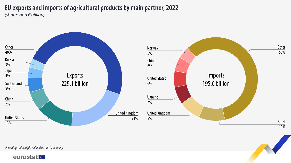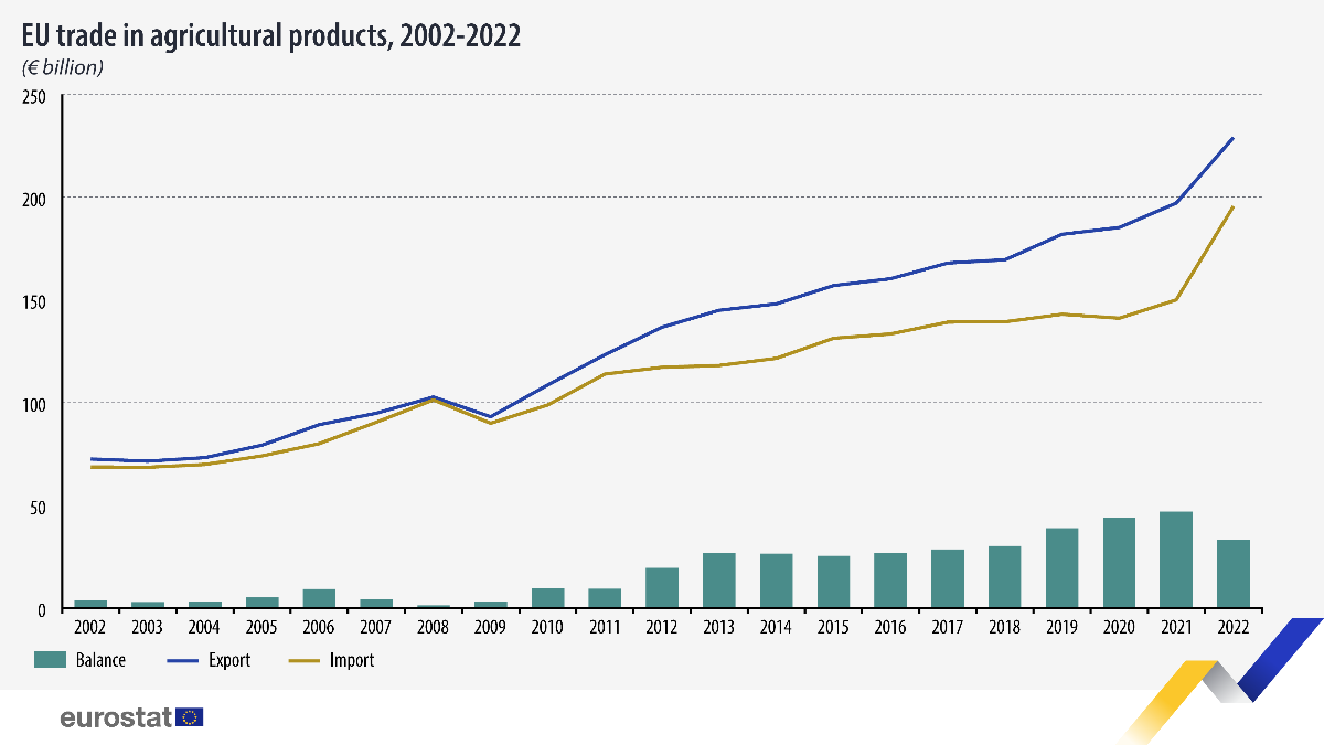 Vrednost trgovine poljoprivrednih proizvoda između EU-a i ostatka sveta je u 2022. godini dosegnula 424,7 milijardi evra, što je 77,5 milijarde € više nego 2021. (347,2 mlrd. €).