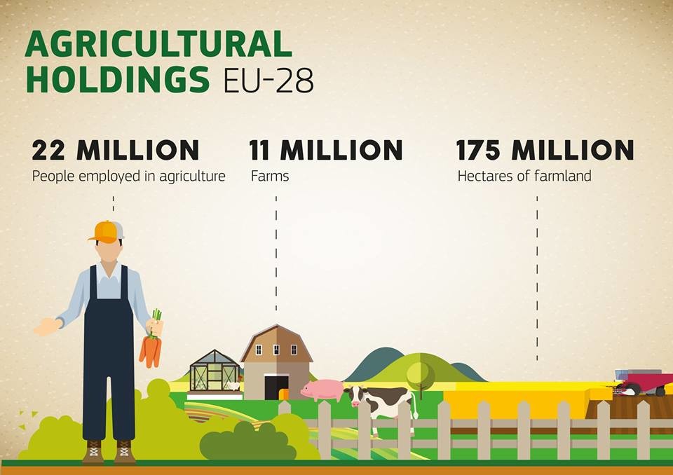 Evropski sektor poljoprivrede obuhvata 11 miliona farmi koje obezbeđuju posao za oko 22 miliona poljoprivrednika. Međutim, taj broj se udvostručava kad se uključe i radna mesta u preradi hrane, maloprodaji i prehrambenom sektoru, čineći tako poljoprivredno-prehrambenu oblast Evropske unije najvećim sektorom zapošljavanja u ukupnoj ekonomiji.