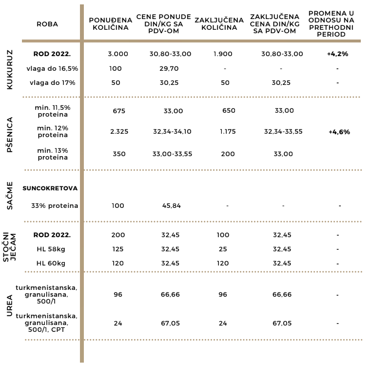 Posle dužeg vremena, beleži se i trgovanje stočnim ječmom. Ugovori za ovu berzansku robu zaključeni su po jedinstvenoj ceni od 29,50 din/kg bez PDV-a (32,45 din/kg sa PDV-om).