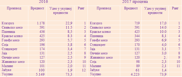 Na samom vrhu rang lestvice nalaze se tri proizvoda stočarskog porekla. To ukazuje da stočarstvo daje proizvodnju sa najvećom dodatnom vrednosti u poljoprivrednoj proizvodnji.