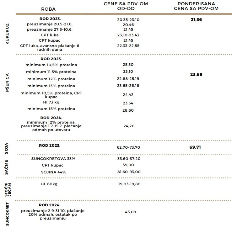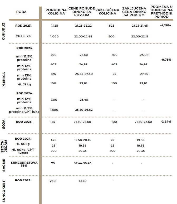 Od ostalih roba, u maju je zaključen i jedan berzanski ugovor za suncokret rod 2024. godine sa preuzimanjem od 2. 9. do 31. 10. 2024. po ceni od 40,99 din/kg bez PDV-a