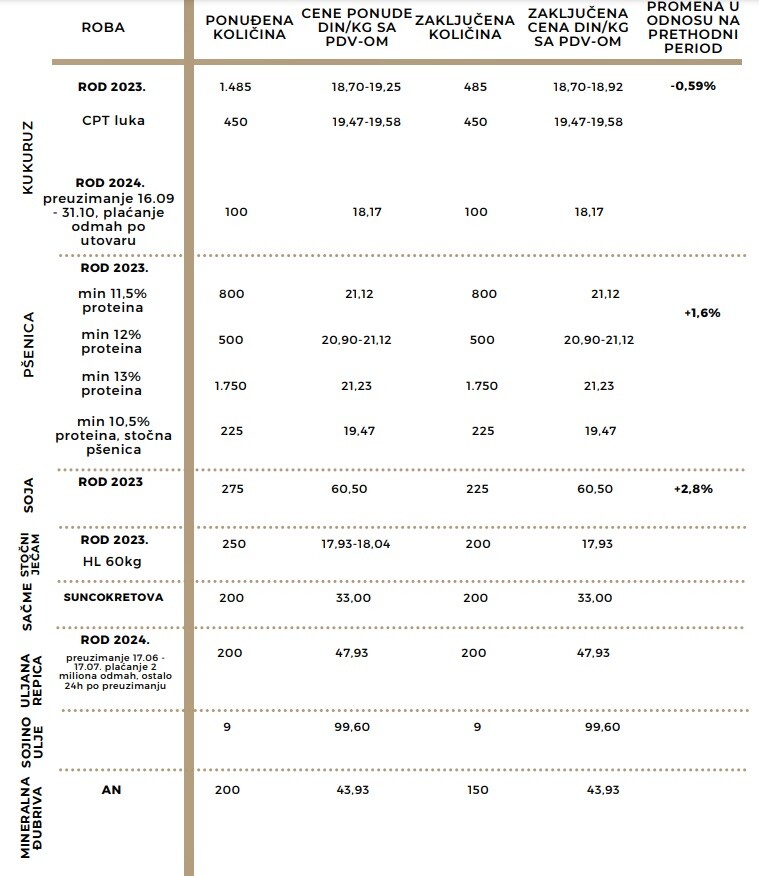 Pregled ponuđenih i zaključenih količina, kao i raspon ponuđenih i zaključenih cena poljoprivrednih proizvoda u posmatranom periodu, dati su u sledećoj tabeli:
