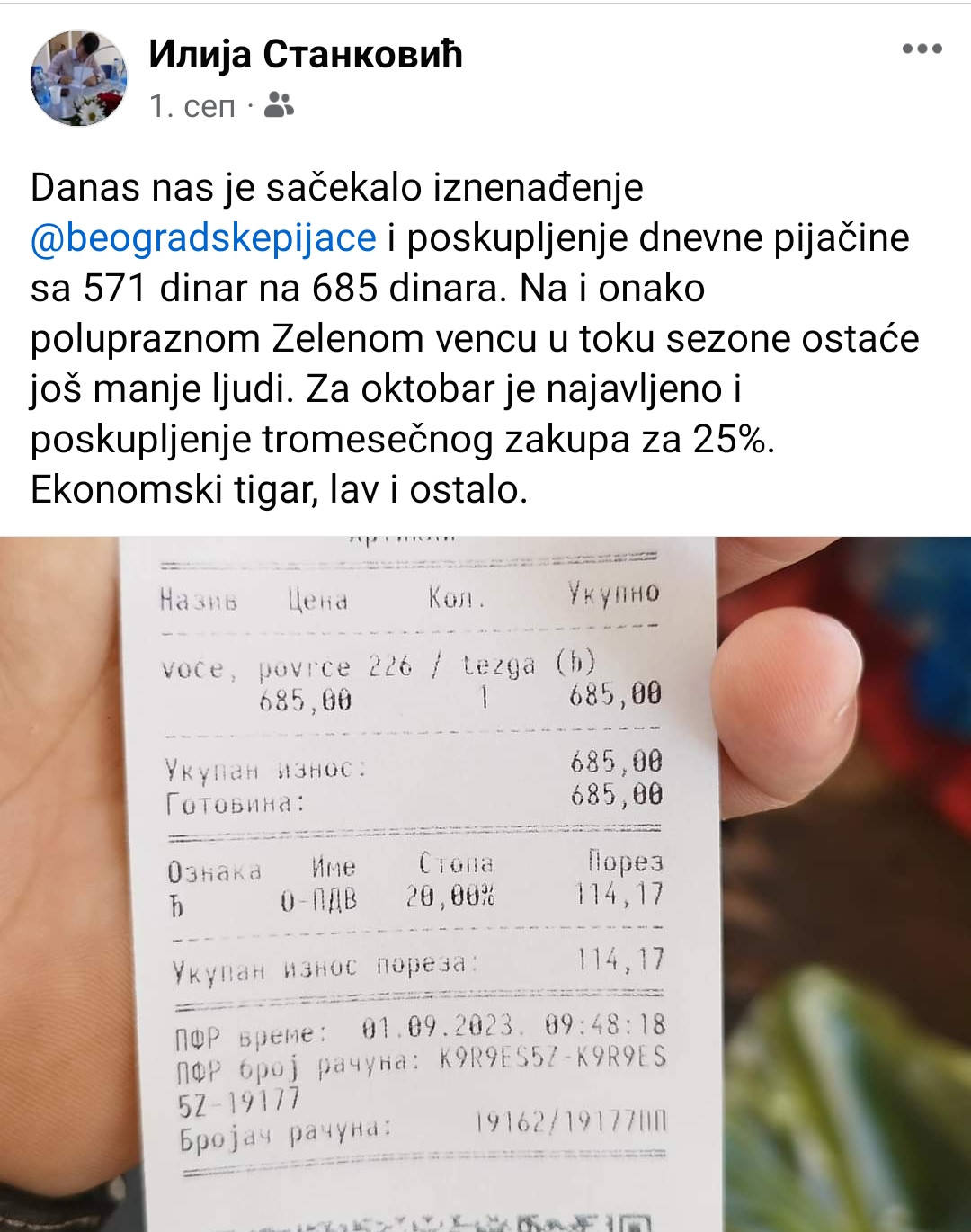 "Mislim da je ovo drugo poskupljenje zakupa u ovoj godini, prvo je bila 12.000 pa 14.000, i sada je 17.500 dinara za tri meseca. Pre poslednjeg poskupljenja dnevna je bila 570, odnosno 600 jer tih 30 dinara, 'pijačinci' - službenici nikad ne vraćaju - to im je bio bakšiš. Pošto mi radimo na dve tezge, cena za drugu tezgu je bila oko 800 dinara, što da ti imaš jednu tezgu koju si licitirao, ali kada se pomeriš na još jednu, umesto da bude jeftinija, ona je još skuplja", objašnjava Stanković koji svoje voće prodaje na Zelenom vencu u Beogradu, a od JKP "Beogradske pijace" do objave ovog teksta nismo dobili odgovore o poskupljenjima zakupa tržnica glavnog grada.