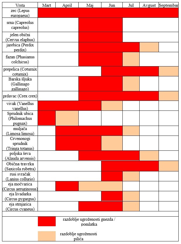 Razdoblje ugroženosti pojedinih vrsta od poljoprivredne mehanizacije može se videti u tabeli koja je deo završnog rada Stradanje divljači od poljoprivredne mehanizacije, Nemanje Irića.
