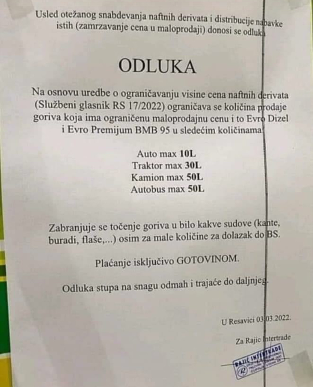 Kao što se vidi na pečatiranom dokumentu, na pumpi u Resavici, vozači automobila ne mogu sipati više od 10 litara, traktor više od 30, a kamion i autobus mogu da napune rezervoare samo do 50 litara. Podsetimo, da je Uredbom o ograničenju visine cena naftnih derivata, propisano da privredni subjekti ne smeju isporučivati proizvode u količinama manjim od prosečnih u poslednjih 12 meseci. Takođe, ova uredba važi 30 dana, tačnije do 11. marta.