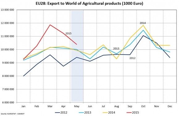 I dok je Rusija odgovorna za 10 % EU izvoza poljoprivrednih proizvoda u 2013. godini (a zabranjeni proizvodi čine 4 % izvoza), vrednost ukupnog EU izvoza je povećana za 5 % od avgusta 2014. do maja 2015. godine, u poređenju s istim periodom lane.