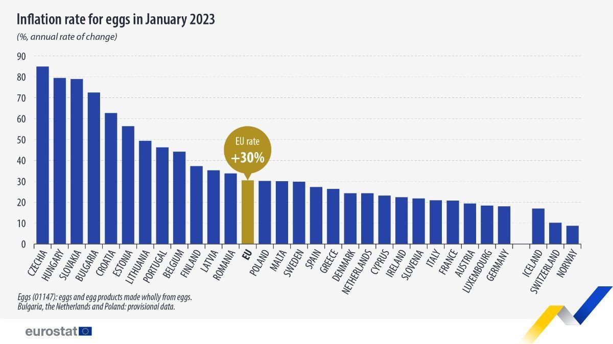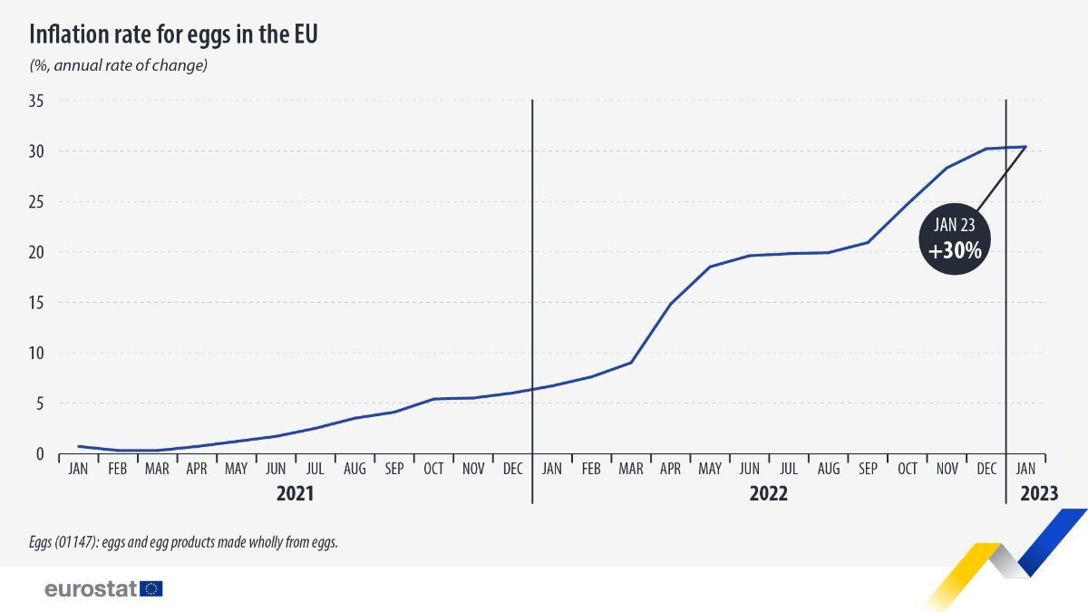 Podaci Eurostata za januar 2023. pokazuju da je cena jaja u EU u proseku bila 30 odsto viša nego u januaru 2022.