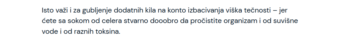 Zato nije tačna tvrdnja da sok od celera čisti organizam i dovodi do mršavljenja. To je nutritivno bogata namirnica koju možemo uključiti u ishranu, ali nije čudotvorni preparat za detoksikaciju organizma ili sredstvo za mršavljenje.