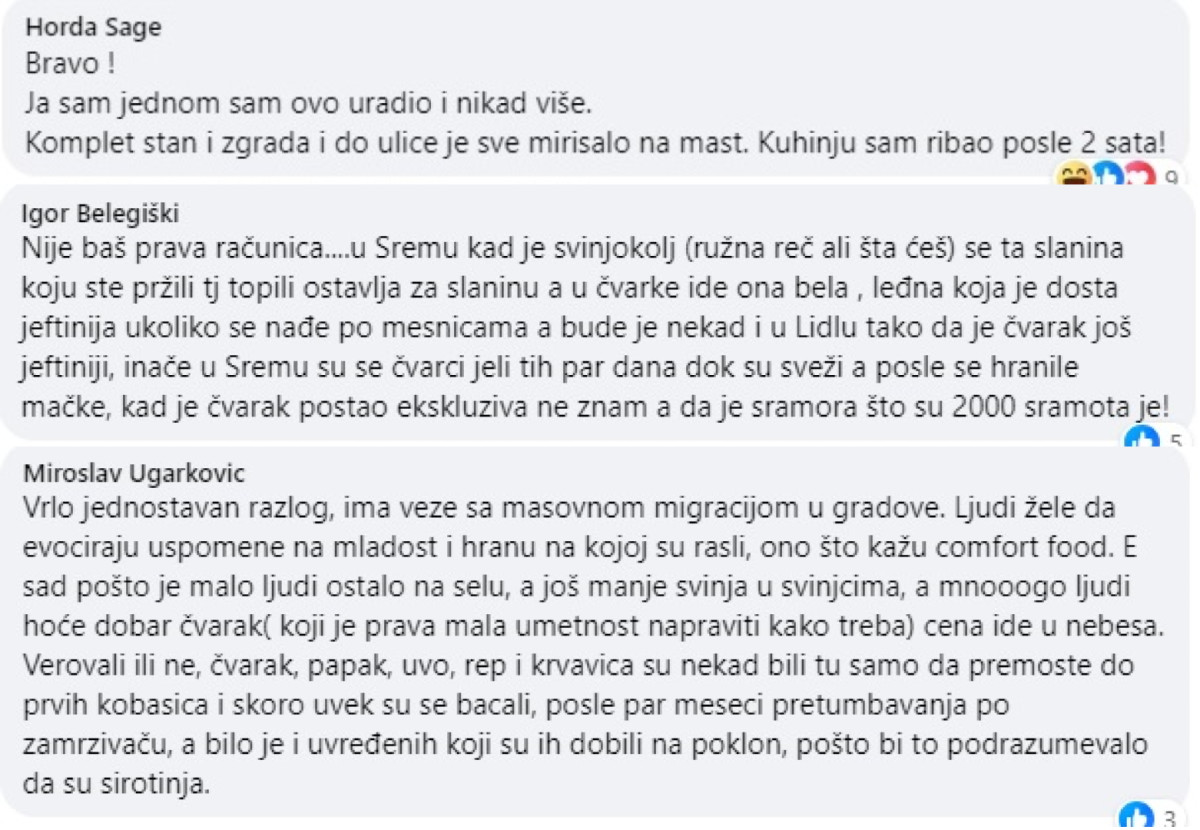 Na Fejsbuk stranici "Gastronomska nacija", koja broji više od 4.000 članova, jedan od njih je podelio i svoju računicu vezanu za uštedu kada su čvarci u pitanju. Uz "račun", priložio je i snimak pravljenja u kućnim uslovima.