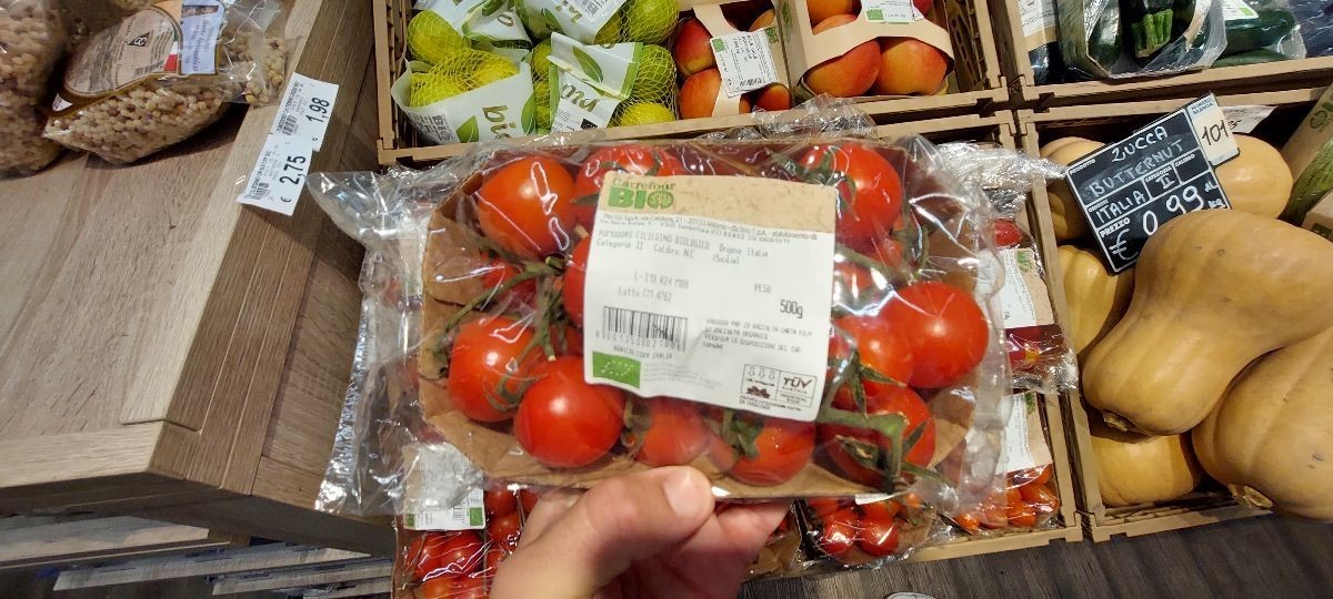 Čeri paradajz u pakovanju od pola kilograma može da se kupi za 2,75 do 2,80 evra, skoro po istoj ceni kao kod nas, ali iz konvencionalne proizvodnje.