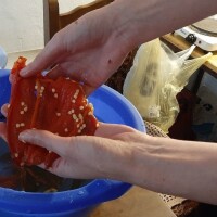 "Oljuštenu papriku iz posude za ceđenje premestim u mrežaste dzakove i ostavim preko noći kako bi se paprika dodatno ocedila", kaže ova domaćica i dodaje da oceđenu papriku sutradan melje u električnoj mašini za mlevenje, a potom je prebacuje u šerpu sa zejtinom i kuva narednih nekoliko sati u zavisnosti od jačine vatre.
