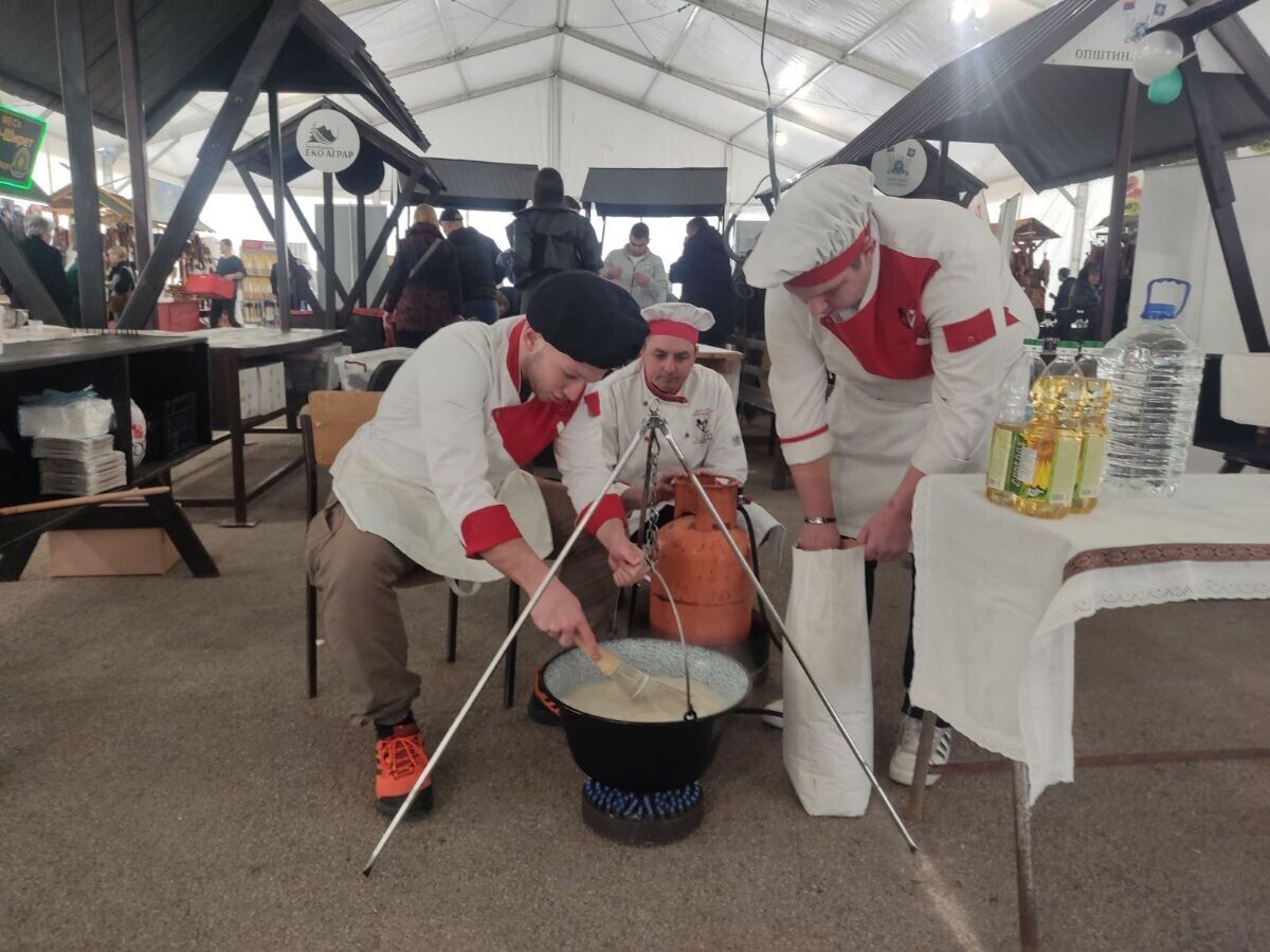 Veliku pažnju su privukli profesor kuvarstva i njegova dva učenika iz Ugostiteljsko turističke škole u Čajetini. Oni su kuvali kačamak za posetioce sajma.