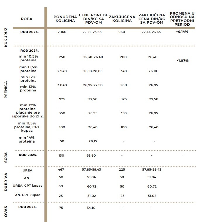 Pažnja učesnika na tržištu ove nedelje je bila usmerena na pšenicu, pa je ona bila primarna kultura u trgovanju, čineći 68 odsto ukupnog nedeljnog prometa. Tražnja za ovom kulturom je bila povećana i mahom usmerena na pšenicu sa 11-11,5 odsto proteina. Berzanski ugovori zaključeni su u cenovnom rasponu od 23,80 do 25,00 din/kg bez PDV-a u zavisnosti od parametara kvaliteta i pariteta.