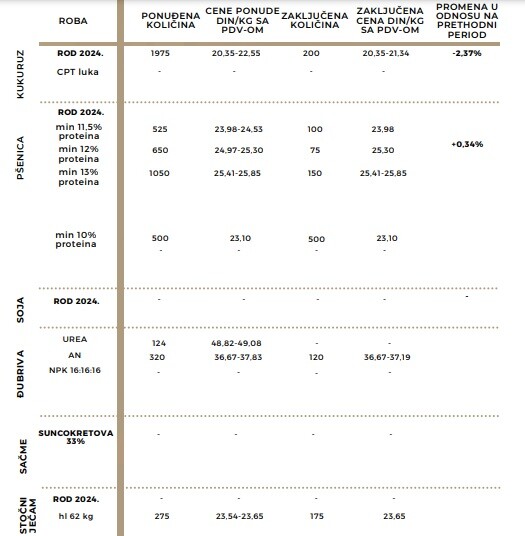 Berzanski ugovor za stočni ječam zaključen je prvog radnog dana po ceni od 21,50 din/kg bez PDV-a. Dalje ponude ove žitarice, tokom nedelje, nisu naišle na odgovor tražnje. Kada su u pitanju mineralna đubriva, berzanski ugovor za AN, ruski 25/1 po ceni od 33,81 din/kg (288 eur/t) bez PDV-a, dok je AN, ruski u džambo vrećama prometovan po ceni od 33,34 din/kg (284 eur/t) bez PDV-a.