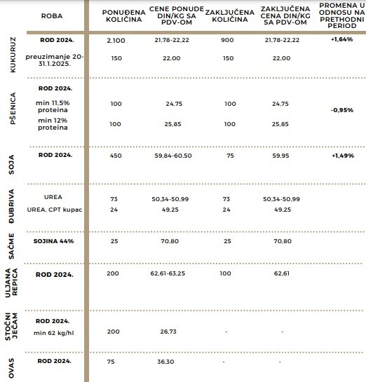 Ponderisana cena dostigla je 20,02 din/kg bez PDV-a (22,02 din/kg sa PDV-om). Za poređenje, u istom periodu prethodne godine ponderisana cena kukuruza iznosila je 17,92 din/kg bez PDV-a, što je za 11,72 odsto niže od ovogodišnje cene. Kukuruz je dominirao trgovanjem tokom proteklih pet dana, čineći čak 68 odsto ukupnog nedeljnog prometa.