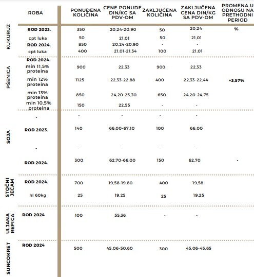 Zaključen je i jedan berzanski ugovor za kukuruz rod 2023.godine (do 20ppb) po ceni od 18,40 din/kg bez PDV-a. U ukupnom obimu prometa kukuruz je učestvovao sa samo šest odsto udela.