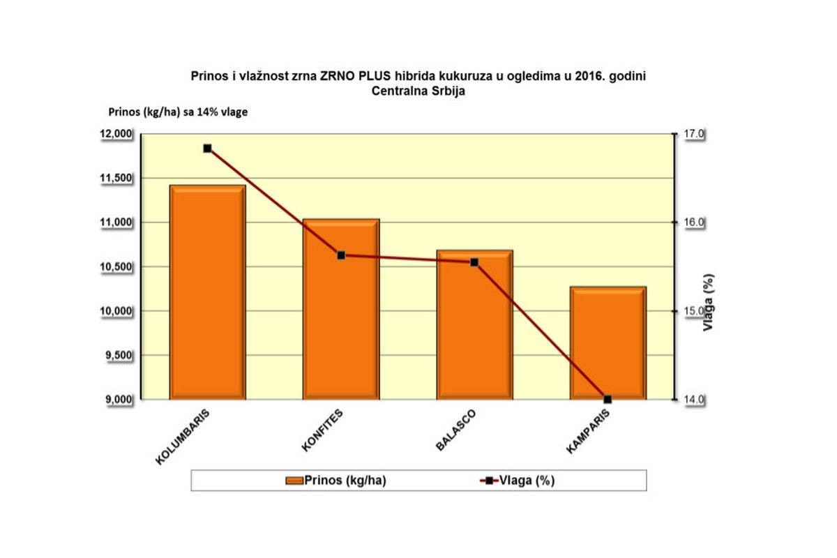 Grafikon 1: Rezultati ogleda hibrida Zrno Plus u Centralnoj Srbiji, 2016. godina