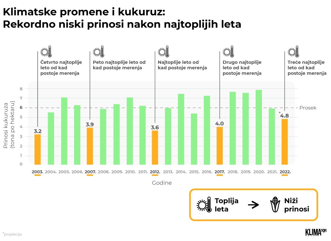Krivac za ovako niske prinose je - vreme. Kako se navodi u sezonskom izveštaju RHMZ Srbije, leto 2022. bilo je treće najtoplije od kad postoje merenja, ali i rekordno vrelo u mnogim delovima Vojvodine. Dok su pošteđeni južni i centralni delovi Srbije, stotine hiljada hektara polja kukuruza u Vojvodini nalaze se upravo u jednoj od najteže pogođenih regija, zajedno sa ostatkom Panonske nizije.