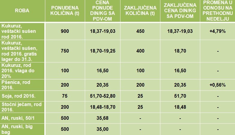 Kukuruz je poskupeo za 2,69%. Cena pšenice je stabilna, a nije se menjala ni cena soje. Trgovalo se i suncokretovom i sojinom sačmom.